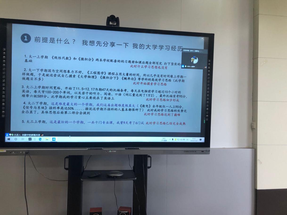 7月22日上午9点,太阳成集团tyc9728在21号楼303会议室举办线上优秀毕业生经验分享会,2020届校“学习之星”、已获得清华保送直博资格的2016级优秀毕业生刘震宇为2019级和2018级本科生分享了学习经验及大学成长体会。